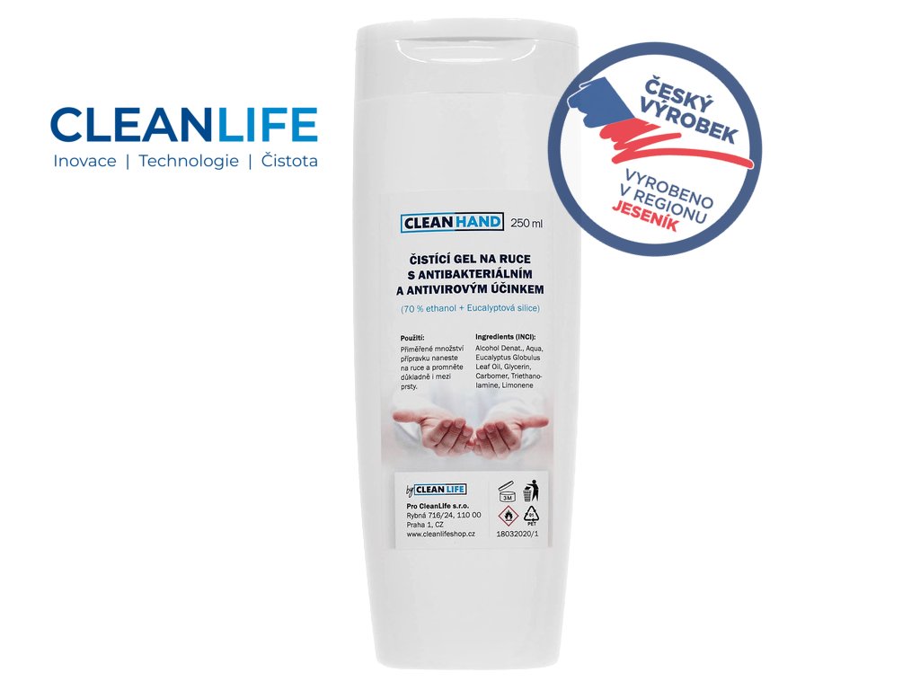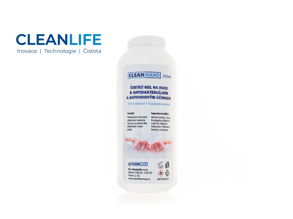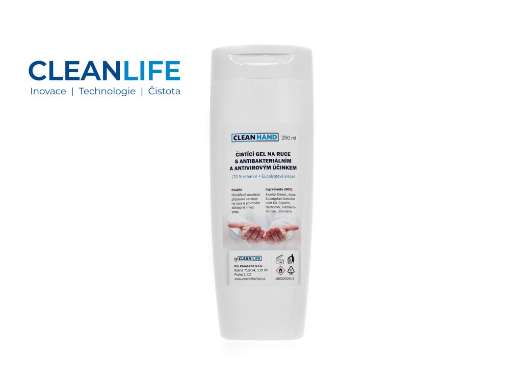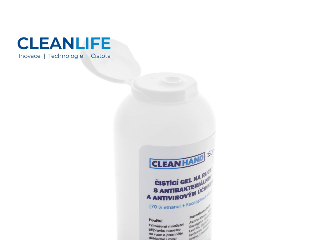 CLEANLIFE dezinfekční gel na ruce 250 ml je účinný a zároveň šetrný přípravek určený pro hygienickou dezinfekci pokožky rukou, zejména tam, kde není snadný přístup k vodě a mýdlu. Gel je založen na 70 % ethanolu a kombinuje čisticí účinky s antibakteriálním i antivirovým působením. Pro příjemný pocit a osvěžení obsahuje přírodní eukalyptovou silici, která ruce nevysušuje, ale zároveň pomáhá maskovat čistý, ostrý zápach alkoholu. Uzávěr typu flip top umožňuje pohodlné dávkování i jednou rukou.