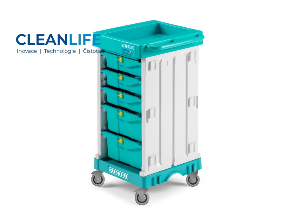 Vnitřní uspořádání tvoří 5 vaniček: dvě větší o objemu 22 l a tři menší po 10 l, což umožňuje přehledné roztřídění potřeb. Mezi příslušenstvími je možné objednat rozdělovníky pro vaničky, držáky dezinfekce a rukavic, boční vaničky nebo brzdy na kolečkách.