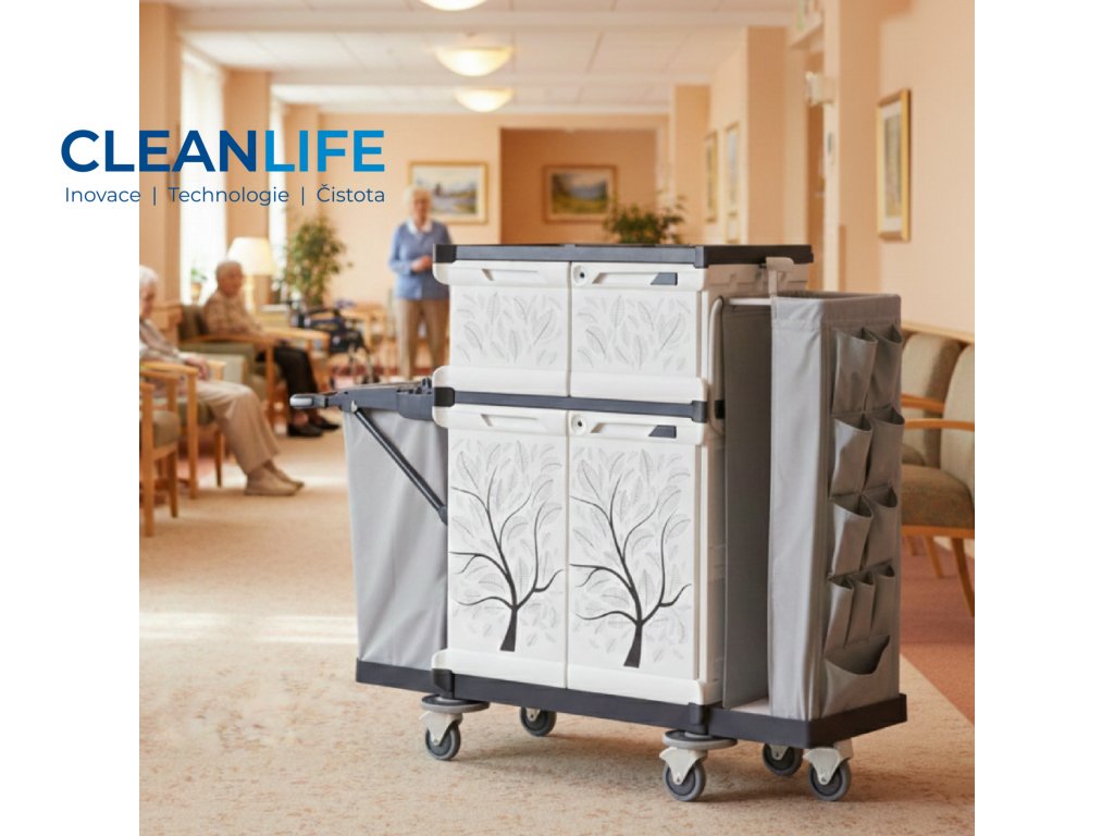 Uzavřená konstrukce s uzamykatelnými dvířky chrání obsah vozíku před kontaminací, prachem i nežádoucí manipulací. Díky promyšlenému vnitřnímu uspořádání nabízí vysokou kapacitu při zachování kompaktních rozměrů a výborné ovladatelnosti. Tichá gumová kolečka umožňují plynulý pohyb i v nočních provozech bez rušení pacientů či hostů.