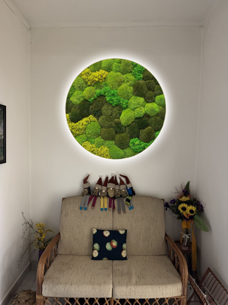 Díky stabilizovanému mechovému povrchu a preciznímu zpracování se obraz snadno udržuje — stačí jej občas jemně očistit od prachu, nevyžaduje vodu ani chemii. Nabízíme možnost přizpůsobit motiv, tvar a rozměr obrazu podle Vašich představ či firemního stylu, takže dekorace může být jak výrazným designovým prvkem, tak decentním doplňkem.