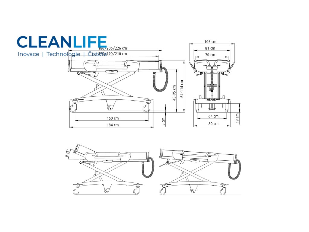Funkce a prvky: Sprchovací lehátko Marina Deluxe je vybaveno hydraulickým ovládáním výšky a sklonu opěradla, což přináší maximální komfort ošetřujícím i klientům. Bezpečnost zajišťují sklopné boční zábrany a ochranná clona, která zabraňuje nechtěnému pohybu pacienta. Ergonomická lehací plocha je potažena hygienickým a omyvatelným materiálem, konstrukce z hliníku má antikorozní úpravu vhodnou i pro vlhké prostředí.