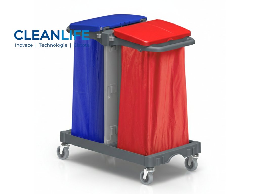 Ergonomický držák vaků umožňuje jejich snadné upevnění i vyjmutí bez nutnosti zvedat obsah – to snižuje fyzickou zátěž obsluhy a zvyšuje komfort při práci. Vozík je osazen kolečky o průměru 100/125 mm, která zajišťují plynulý a stabilní pohyb i na hladkých podlahách.