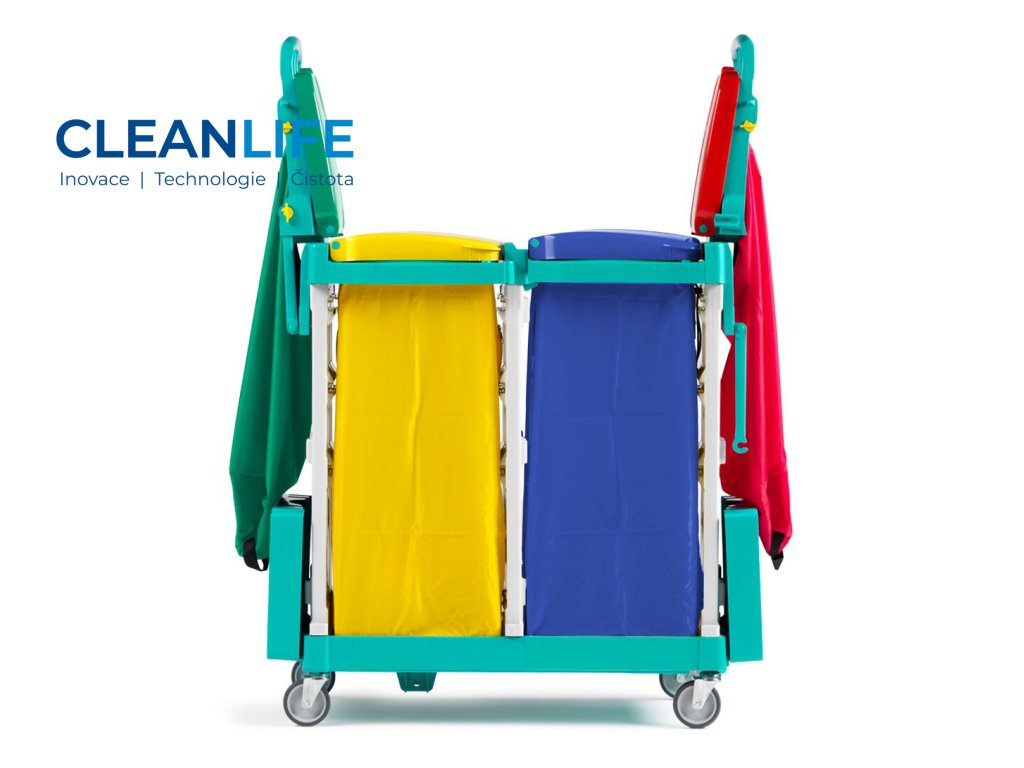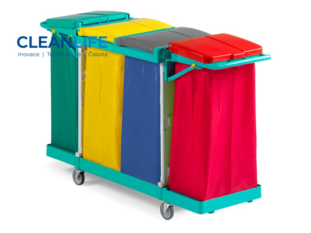 Model je vybaven čtyřmi držáky vaků – dvěma pro vaky o objemu 120 l a dvěma pro vaky o objemu 150 l. Toto uspořádání umožňuje oddělení různých druhů odpadu nebo prádla podle interních hygienických a logistických pravidel provozu. Třídění usnadní i 4 různě barevná víka.