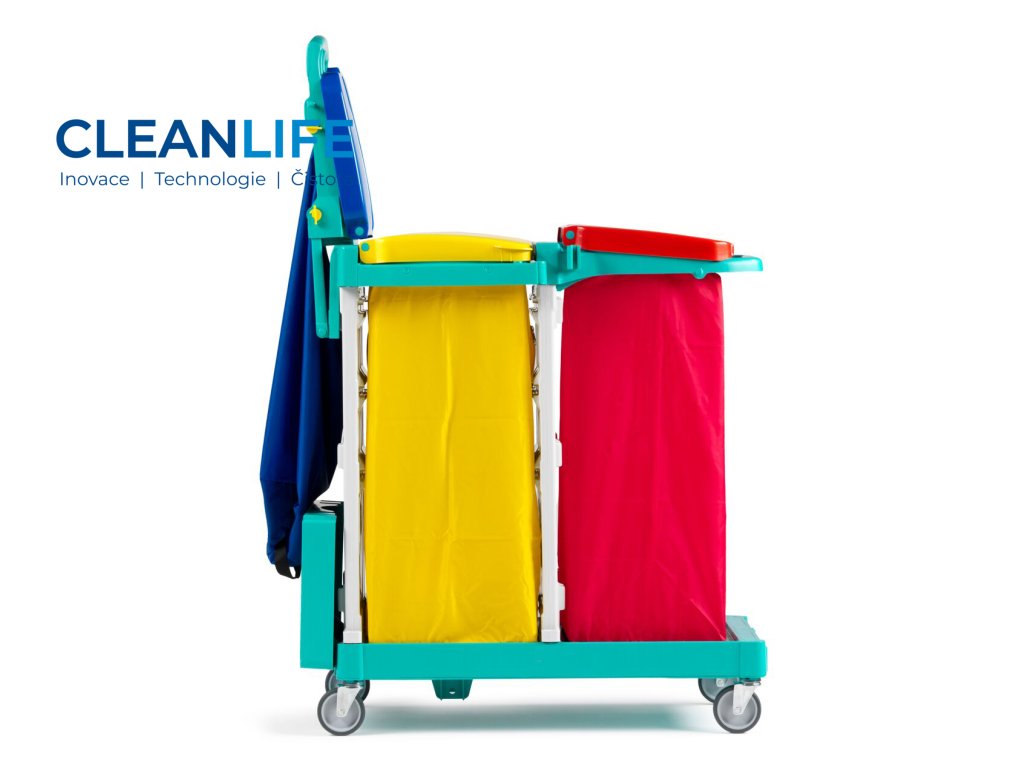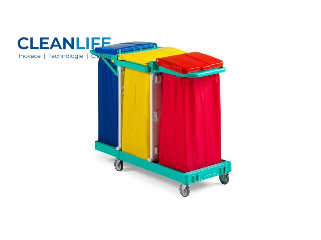 Model je vybaven třemi držáky vaků (2×120 l a 1×150 l), což umožňuje oddělení různých druhů odpadu nebo prádla podle interních hygienických a logistických pravidel provozu.